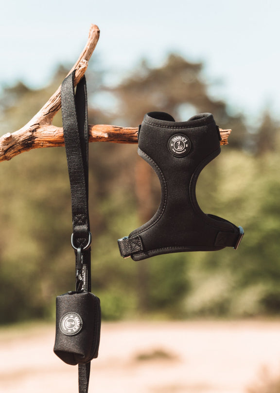 Onze zwarte set biedt niet alleen stijl, maar ook functionaliteit, met de poepzakjeshouder die bij de set inbegrepen zit. Of het nu gaat om een ontspannen wandeling door de buurt of een actief avontuur in de natuur, deze set voorziet in al je behoeften op het gebied van hondenaccessoires. De zwarte set is erg gemakkelijk schoon te maken. Check onze website voor de wasvoorschriften.